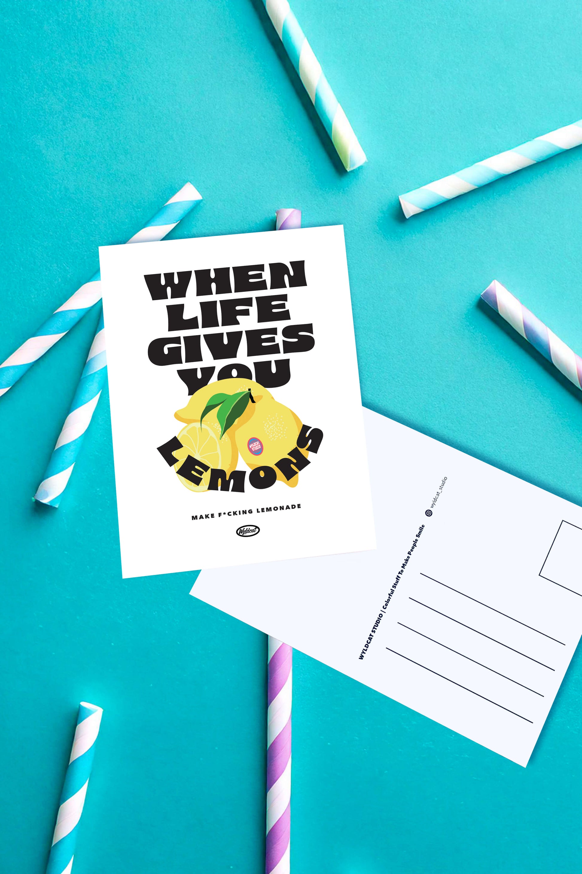 🍋 La vie te donne des citrons ? Notre carte postale 'When life gives you lemons' est là pour te rappeler quoi en faire ! Imaginée par Wyldcat Studio et dispo en exclu sur ALLMEMBERZ, elle mixe typographie impactante et illustration de citrons juteux pour un message qui fait du bien. Un design qui transforme le fameux dicton en manifeste moderne avec une bonne dose d'attitude.
